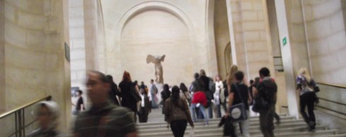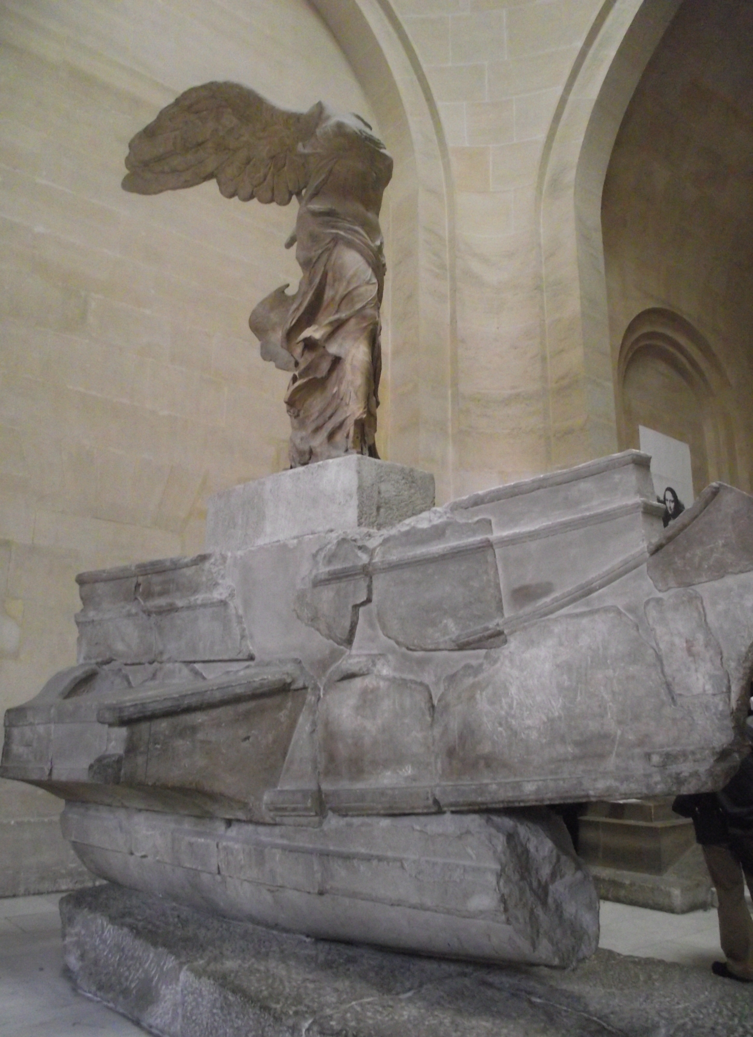 Seguindo por este corredor, em uma linha reta, você irá se deparar com uma escadaria que apresenta uma grande e bela escultura em seu topo. Esta escultura trata-se exatamente da Vitória Alada da Samotrácia, datada do século 3 a.C.). Fotos abaixo: