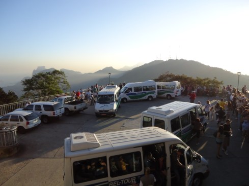 Até aí tudo bem. O que eu não sabia é que lá em cima, bem antes do topo, há duas filas: uma para comprar o bilhete de acesso  e outra para pegar as vans oficiais, as únicas que, atualmente, podem subir até a entrada para o Cristo.
