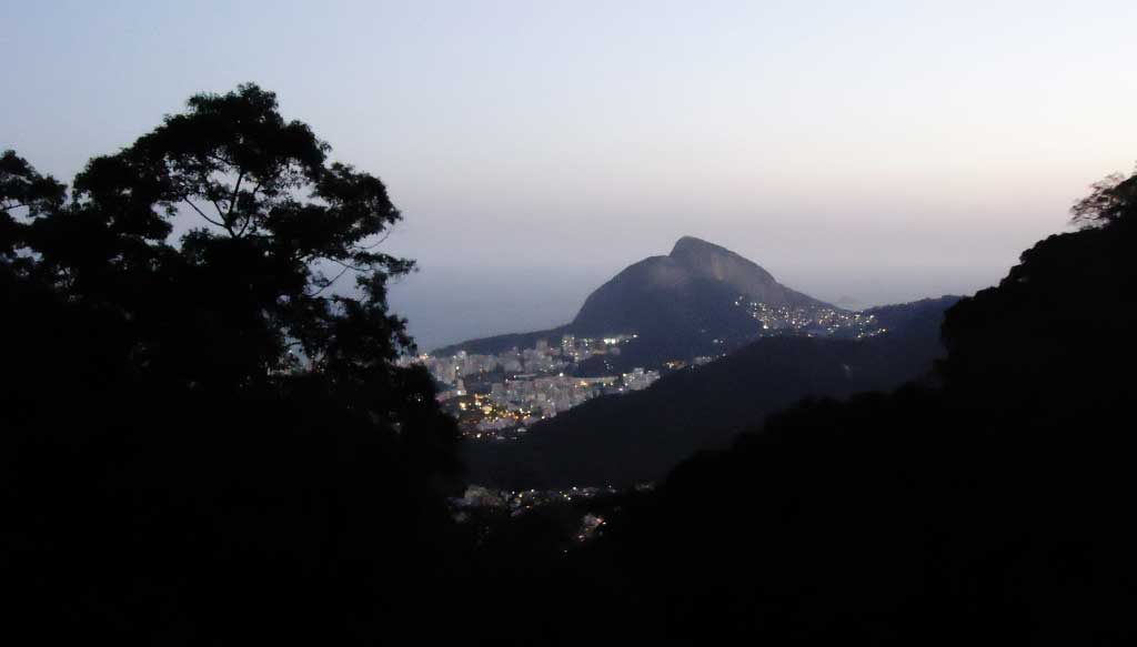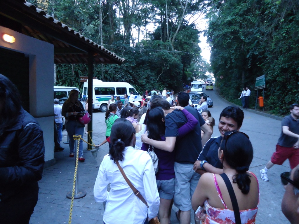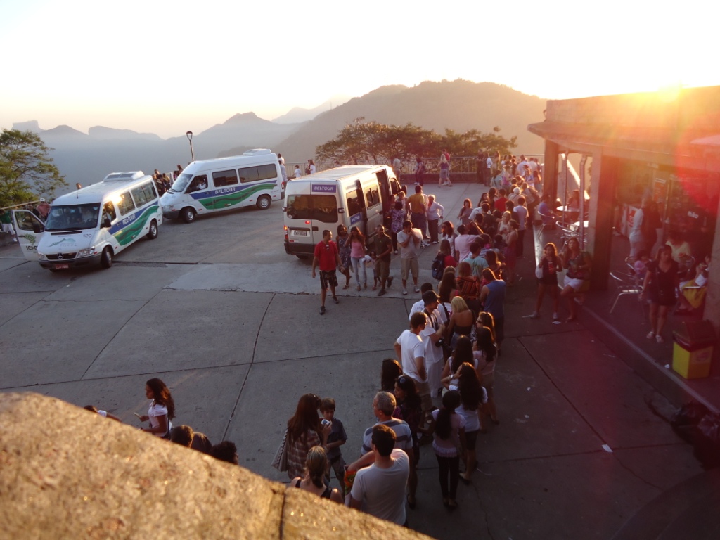 Tá? E agora? A Bel-Tour te deixa no mesmo ponto onde te pega. Como fazer valer a volta na van da cooperativa? Muito simples… Depois do local onde as vans da Bel-Tour param, há um… sei lá… casarão desativado onde as vans da cooperativa pegam o pessoal que está com o adesivo (aquele amarelinho lá do início do passeio)… Ah – Ah – Ah… Só pra variar, mais uma fila e, depois de todo sufoco para subir, ainda passamos mais 50 minutos na fila para conseguir descer… Aproveitei para tirar mais uma foto do Rio anoitecendo…
