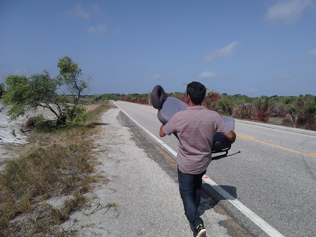 Pronto! Com dois bancos e uma sombra, montamos nosso próprio oásis à beira da estrada. Só ficou faltando um isopor, equipado com umas cervejas e refrigerantes, porque pão integral de ameixa eu tinha na mala. Matamos o tempo falando besteira, comendo pão de ameixa e rindo da cara dos motoristas que passavam olhando pra gente, sem entender nada. Eis a nossa limonada! 🙂