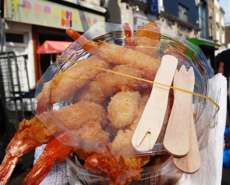 Nós acabamos laçados por uma “box” de camarões  quentinhos e crocantes, recém saídos do frigideira: