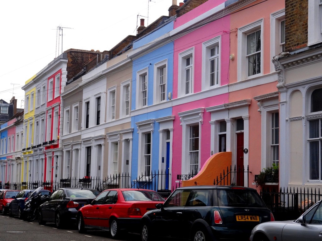 Entre uma loja e outra, ainda é possível ir admirando a arquitetura geminada e colorida, característica de Notting Hill.