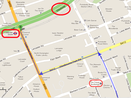 Uma Livraria chamada Notting Hill Bookshop (The Travel Book Co) – em Bleinheim Crescent, próximo à esquina com Portobello Road.