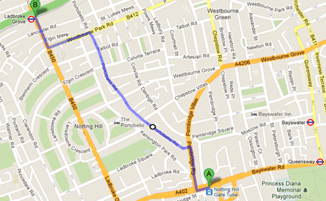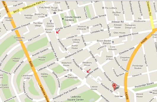 Ocorre que, ao descer em Notting Hill Gate (a estação de metrô), você ainda percorre algumas quadras até alcançar a Portobello Road. Confira no mapa: