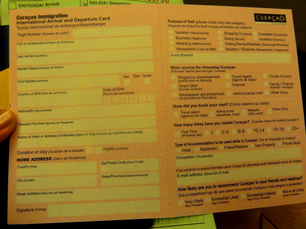 – Para brasileiros, a documentação necessária para entrada em CURAÇAO limita-se a passaporte válido. No avião, como de costume, você deverá responder ao formulário de imigração, em papel cartão rosinha bebê, uma meiguice.