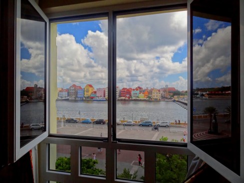 – Estamos nada menos que em Brionplein (não se iluda, também não me diz muita coisa), em Otrobanda. De cara com a ponte móvel Queen Emma, que liga Otrobanda a Punda, no miolinho animado onde tudo acontece, tanto de um lado (Punda), como de outro (Otrobanda). Perfeito. Não bastasse isto, a vista da nossa janela… … Mata qualquer um de inveja: