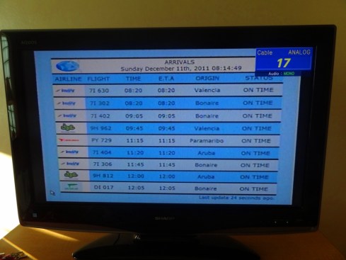 – E o que descobrimos por acaso, procurando algo para assistir na TV: o CANAL 17, que mostra a tabela de horários dos voos do Aeroporto Internacional de Curaçao:
