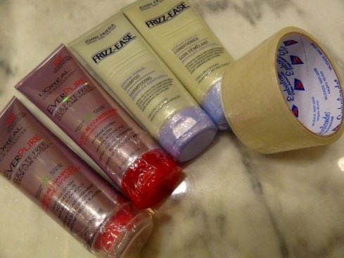 Como na BAGAGEM DE MÃO, em voos internacionais, só são permitidos líquidos/cremes na medida exata de até 100 ml, o jeito é colocar tudo que ultrapasse essa medida na bagagem de porão.  Nesse caso, pra não correr o risco de encontrar suas roupas mergulhadas no condicionador ou coisa parecida, a fita cai com0 uma luva.