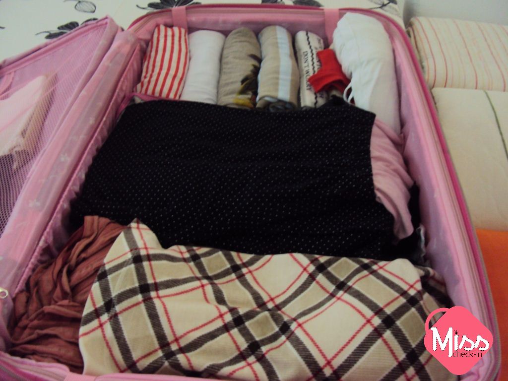 No espaço restante, você pode colocar as peças maiores, como calças jeans e vestidos e/ou blusas mais densas, para o frio. Eu, pessoalmente, monto a mala em camadas, como um pavê (ou sorvete napolitano, se preferir, rs): uma camada de “charutinhos”, outra camada de blusas mais grossas e a última camada de calças jeans. Por fim, cubro tudo com as peças mais finas e com o pijama para, na hora de dormir,  não precisar jogar tudo da mala pra cima só para encontrá-lo: