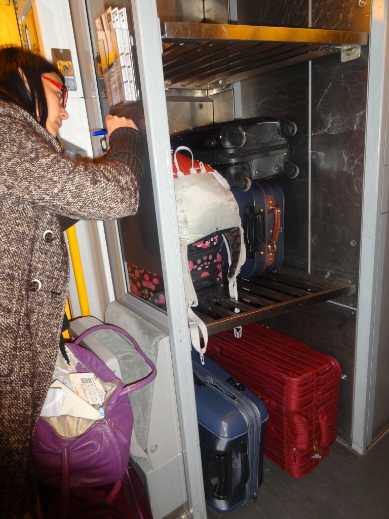 Ocorre que viajar de trem com muitas malas não é legal. Subir, descer e arrastar as malas pelos vagões, além de arrumar um cantinho para toda sua muamba, não é algo assim tão confortável… Ainda mais quando estamos falando de 12 MALAS. Note os compartimentos para bagagem do Eurostar:
