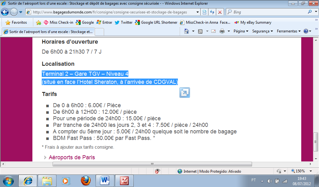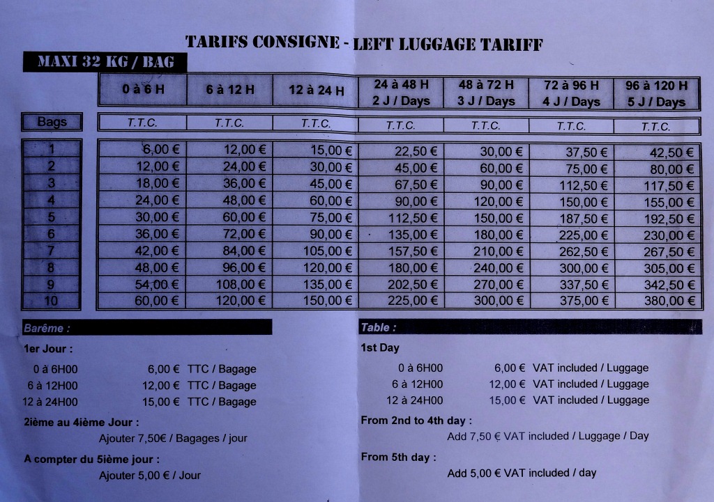 Nós deixamos cinco malas por três dias, o que, como mostra a tabela, nos custou 150 Euros. Caro, eu sei, mas conforto nunca foi barato e para quem, como eu, já perdeu toda sua bagagem em um país estranho (Venezuela), conforto e segurança valem esses Euros a menos na carteira.