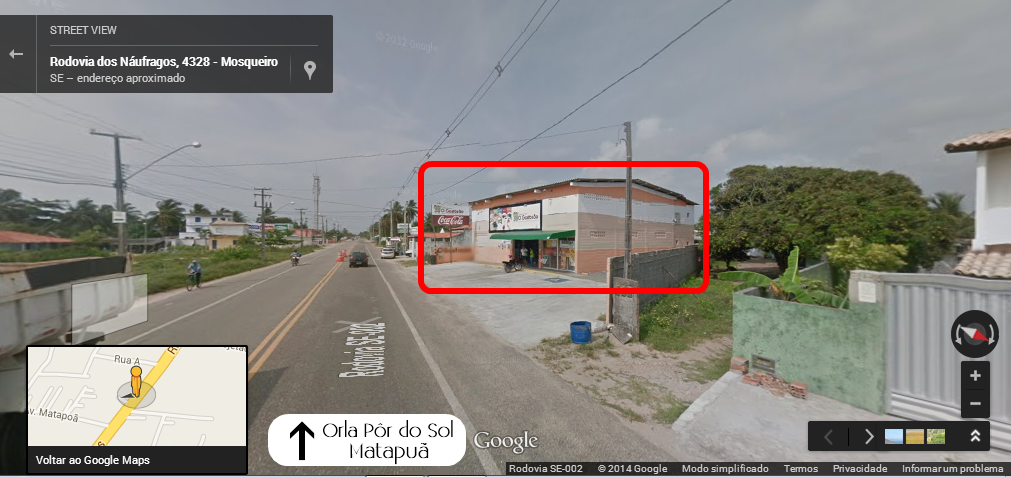 Para chegar também é muito fácil. Vindo da Orla de Atalaia, pegue a Av. Melícia Machado, sentido Orla Pôr do Sol/Ponte Joel Silveira. Siga numa linha reta sempre. Mais à frente, a pista dupla acaba e a avenida torna-se Rodovia dos Náufragos. Permaneça na linha reta até visualizar, à sua direita, o Mercado Costa Azul (antigo Gostosão), destacado em vermelho na foto abaixo, do Google Street View:
