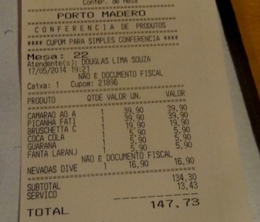 – Os valores do restaurante, em maio de 2014: Prato Executivo R$ 15,50/ Copo de Suco R$ 3,00.