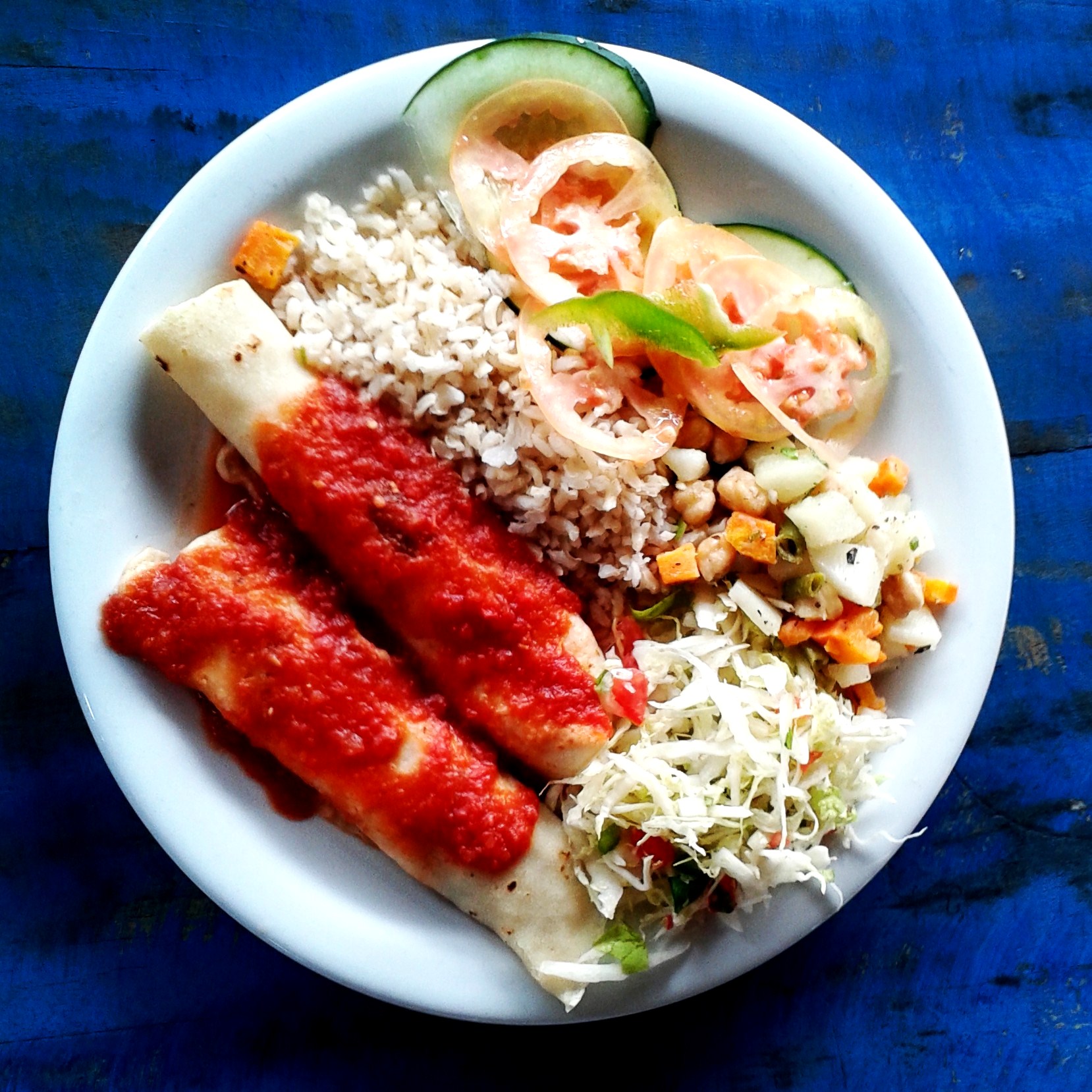 No nosso dia, a opção era panqueca de palmito. O prato executivo veio com duas panquecas, salada de alface, salada de grão de bico, arroz integral, pepinos e tomates, além de uma porção de feijão em caldo e porção extra de molho de tomate.