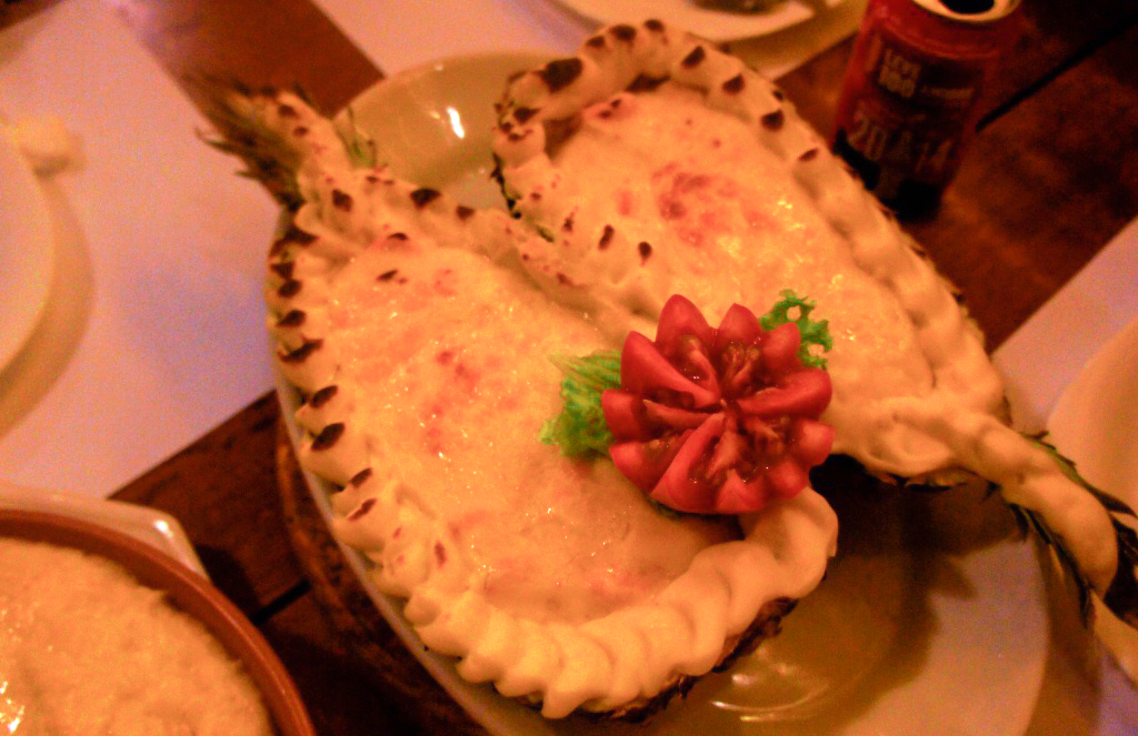Eu, que a amo a combinação de camarão e abacaxi, pedi um camarão tropical ao molho de abacaxi, acompanhado por arroz embebido no mesmo molho (não lembro o nome do prato). Chegou todo bonitão e é muito bem servido.