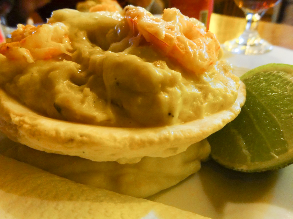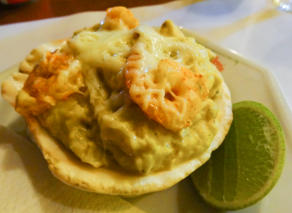 Prepare-se para uma concha de verdade, assentada em uma base de purê e recheada com alguns camarões mergulhados em um creme picante ou agridoce, você escolhe. Nós preferimos o picante, uma combinação de queijos, cebola, mostarda e pimenta calabresa. Perfeito!