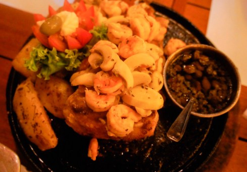 Superada esta etapa, seguimos nossa saga gastronômica nos pratos principais. A dica dessa vez foi o prato Diário do Nordeste, que consiste em peças de sirigado grelhado cobertas por camarões salteados no vinho branco e azeite, champignom e ervas, acompanhado por batatas, arroz e molho de alcaparras. E tudo chega reluzindo e “estalando” numa chapa quente. Perfeito também!