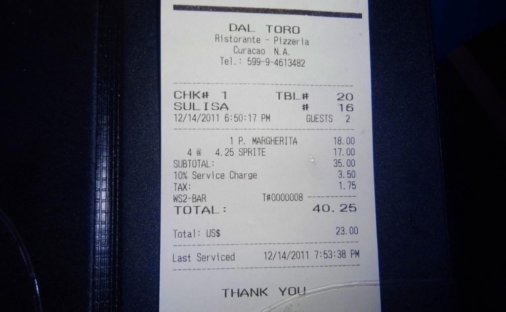 – Não consegui comprar os ditos “florins” em Aracaju. Na verdade, a moeda corrente chama-se, formalmente, Nafl – Florim das Antilhas Holandesas, carinhosamente chamada de florim. Acabamos entendendo que a melhor opção seria comprar dólar para fazer o câmbio aqui mesmo. Hoje, um sábado (10/12/11), não encontramos um banco ou casa de câmbio sequer para fazer a transação. Uma policial, muito solícita, informou que seria possível comprar a moeda com taxitas ou nos Cassinos. Trocamos a moeda no Cassino (e Hotel) Otrobanda, ao lado do nosso hotel. Não tínhamos a menor noção do câmbio, mas havia pesquisado que, oficialmente, seria fixo, 1 dólar = 1,75 Nafl. Compramos 900 florins com 500 dólares (note que a 1,80, o câmbio do cassino não é dos mais favoráveis).