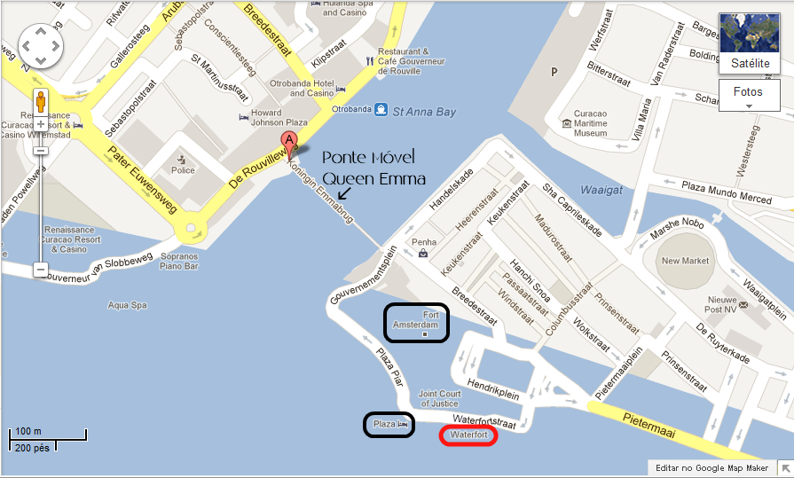 – Estamos nada menos que em Brionplein (não se iluda, também não me diz muita coisa), em Otrobanda. De cara com a ponte móvel Queen Emma, que liga Otrobanda a Punda, no miolinho animado onde tudo acontece, tanto de um lado (Punda), como de outro (Otrobanda). Perfeito. Não bastasse isto, a vista da nossa janela… … Mata qualquer um de inveja: