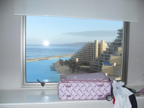 Pegamos um voo para Santiago, onde um translado para Algarrobo já nos aguardava. O translado foi caro, quase R$ 200,00 por pessoa, mas, naquela oportunidade, foi a opção que nos pareceu mais coerente, já que era nossa primeira vez no Chile, chegamos de madrugada e seguiríamos do aeroporto direto para San Alfonso. A viagem até Algarrobo durou pouco mais de uma hora e o translado nos deixou na porta do “nosso prédio”.