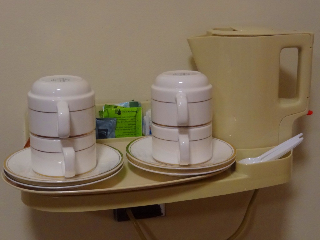 E as instalações do quarto muito funcionais, deixando claro o estilo DIY (do it yourself, em nossas palavras, “faça você mesmo”) de Londres. O quarto era equipado com uma coffee/tea maker (no popular, uma jarrinha que aquece a água para o preparo de chá ou café instantâneo):
