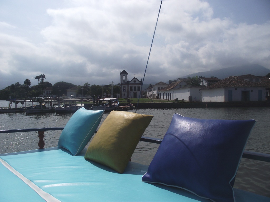 Outro passeio imperdível, sem sombra de dúvidas, é o de barco. Saindo do clima off road da serra, no dia seguinte embarcamos em uma aventura náutica. Seguimos até o largo da Igreja de Santa Rita, cartão postal de Paraty, de onde saem boa parte dos barcos de passeio: