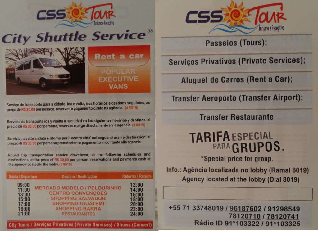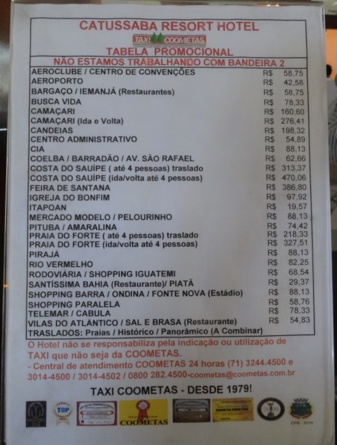 Como disse a princípio, o hotel está mais afastado dos pontos de maior interesse em Salvador, o que o torna uma opção mais viável para quem está de carro. Para quem não está, vi uma tabela de tarifas de táxi (salgadinha… Mas, segundo eles, promocional):