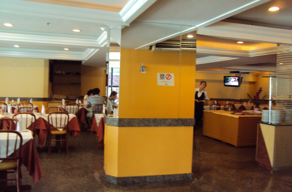 A diária incluía café da manhã, mas como saímos às 05:00h, não usufruímos da refeição. Ainda assim, no check-in, fui até o salão e gostei, me pareceu aconchegante: